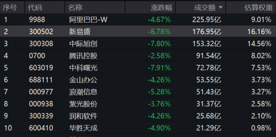 云计算ETF汇添富(159273)标的指数多数飘绿:光模块领跌,新易盛跌超8%,中际旭创跌近8%;其他热门成分股中,中科曙光跌超8%,浪潮信息跌超5%,阿里巴巴跌超4%,金山办公跌超4%,腾讯控股跌超2%。