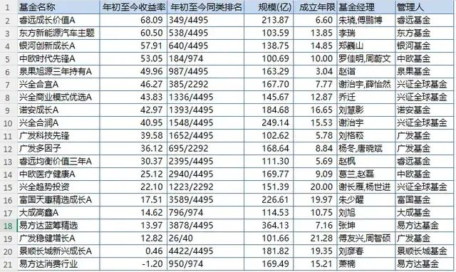 Wind数据显示,市场上规模超百亿元的普通股票型基金、混合型基金(不包含偏债混合型基金,只显示初始基金)共有20只。除了睿远成长价值A收益排在首位之外,排名第二的东方新能源汽车主题收益为60.5%,第三名银河创新成长A收益为57.91%,第四名中欧时代先锋A为53.05%。其他基金的收益均在50%以下。