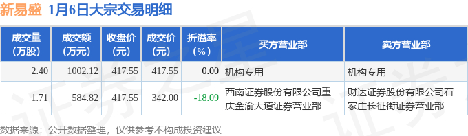 1月6日新易盛现1笔折价18.09%的大宗交易 合计成交1586.94万元