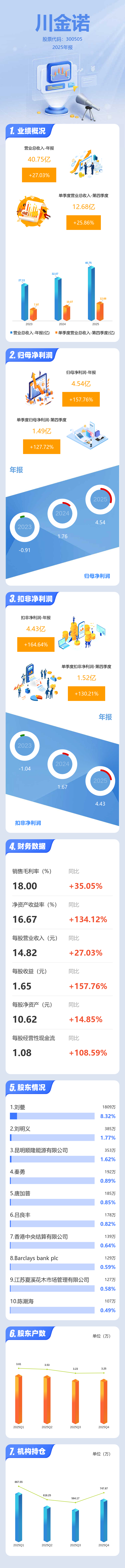 证券之星消息,川金诺2025年年报显示,当年度公司主营收入40.75亿元,同比上升27.04%;归母净利润4.54亿元,同比上升157.77%;扣非净利润4.43亿元,同比上升164.65%;其中2025年第四季度,公司单季度主营收入12.68亿元,同比上升25.87%;单季度归母净利润1.49亿元,同比上升127.72%;单季度扣非净利润1.52亿元,同比上升130.21%;负债率30.9%,投资收益4.35万元,财务费用951.59万元,毛利率18.0%。