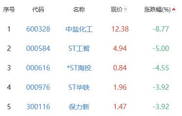 中盐化工、ST工智、*ST海投、ST华铁、保力新位列涨幅榜后五位,涨幅分别为-8.77%、-5.00%、-4.55%、-3.92%、-3.92%。