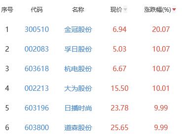 其中,金冠股份、孚日股份、杭电股份、大为股份、日播时尚、道森股份位列板块涨幅前五位,涨幅分别为道森股份20.07%、10.07%、10.07%、10.01%、9.99%、9.99%。