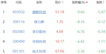 德新科技、保力新、孚日股份、华自科技和尚太科技位列涨幅榜后五位,涨幅分别为-9.66%、-8.16%、-6.76%、-6.42%和-5.36%。