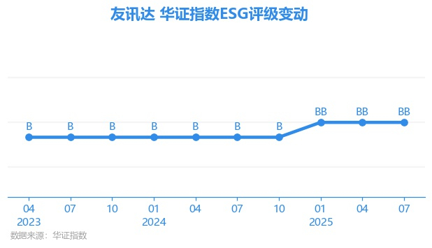 日前,华证指数公布了新一期(2025年7月31日)的ESG评级结果,友讯达(300514.SZ)获得BB评级(华证指数评级为C起至AAA九档,C为最低档,AAA为其最高一级评级/AA为其第二档),上一期(2025年4月30日)ESG评级为BB。本期ESG评级在92家通信设备行业A股上市公司中排名第27(上一期排名第28)。