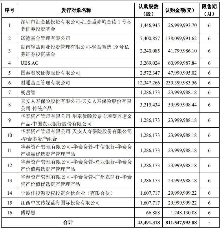 科大国创11月30日发布向特定对象发行股票发行情况报告书,本次发行价格为18.66元/股,发行数量为4349.1318万股,募集资金总额8.12亿元,扣除与发行相关的费用后,实际募集资金净额为8.04亿元。发行对象最终确定为16名投资者,财通基金、国泰君安、UBS AG等获配。