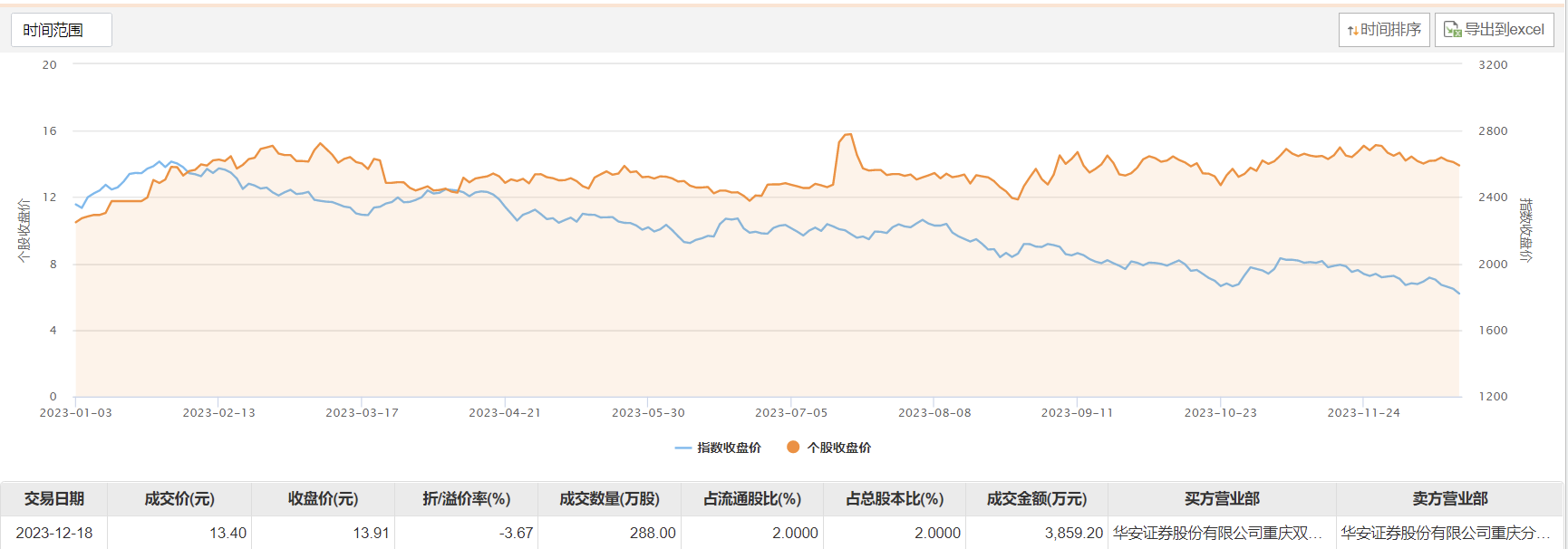 今日大宗交易成交288万股,成交额3859.2万元,占当日总成交额的62.02%,成交价13.4元,较市场收盘价折价3.67%。