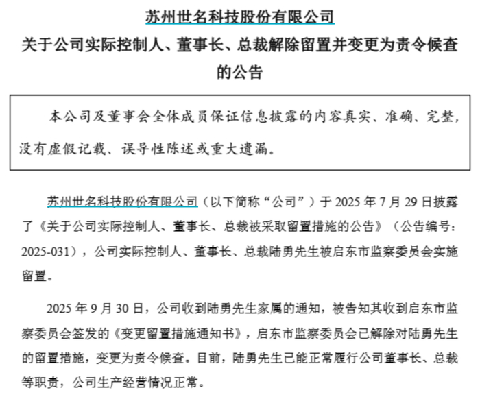 近日,世名科技盘后公告,9月30日公司收到公司实际控制人、董事长、总裁陆勇家属的通知,被告知其收到启东市监察委员会签发的《变更留置措施通知书》,启东市监察委员会已解除对陆勇的留置措施,变更为责令候查。目前,陆勇已能正常履行公司董事长、总裁等职责,公司生产经营情况正常。