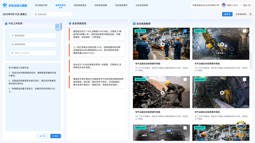 这种创新模式的核心,在于将企业专属知识与智能体深度融合:知识图谱为智能体提供 “决策依据”,智能体则将知识转化为“实际行动”。以班前会场景为例,系统会先通过知识图谱关联作业人员当日作业计划与历史事故案例,自动提取 “高瓦斯区域作业”“临时用电操作” 等高风险点,再由智能体生成专属提醒清单,并推送相关安全警示视频——这种 “从业务中来,到业务中去” 的创新,让AI真正融入了煤矿安全生产日常管理,而不再是 “空中楼阁”。