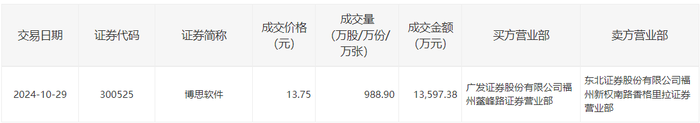 博思软件今日大宗交易折价成交988.9万股,成交额1.36亿元
