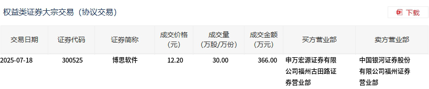 博思软件今日大宗交易折价成交30万股,成交额366万元