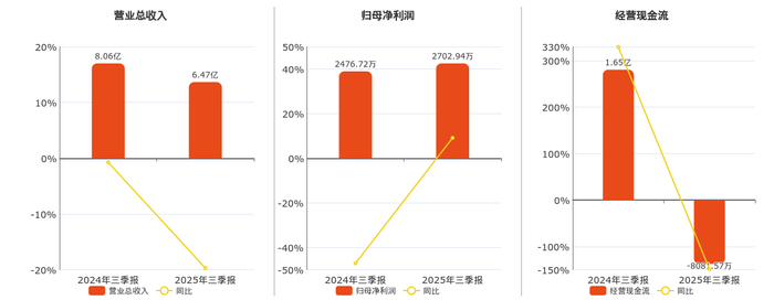公司营业总收入为6.47亿元。归母净利润为2702.94万元,较去年同报告期归母净利润增加202.75万元,同比较去年同期上涨8.11%。经营活动现金净流入为-8081.57万元。