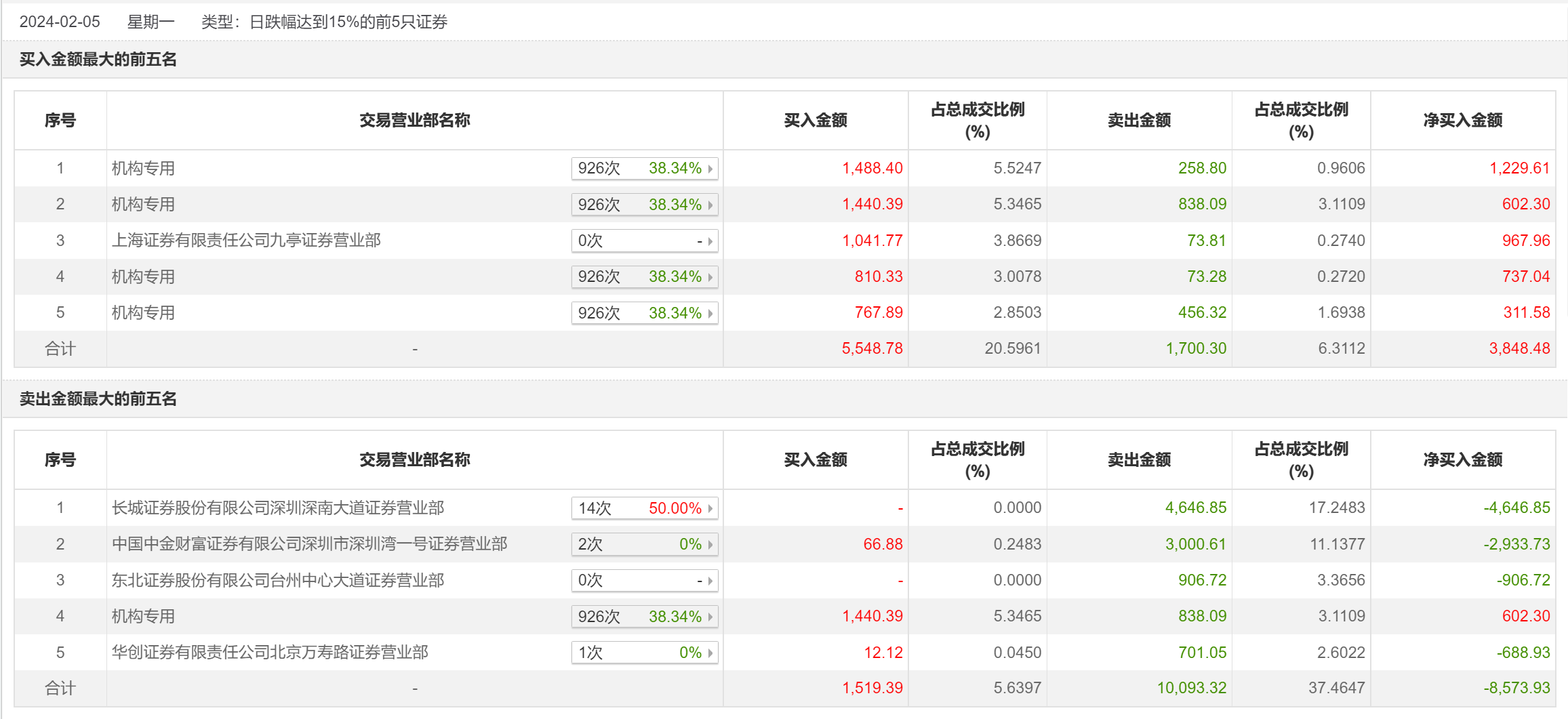 2月5日,农尚环境今日跌停,全天换手率达6.52%,振幅达19.99%。龙虎榜数据显示,营业部席位合计净卖出5327.74万元。其中,机构买入4507.01万元,卖出1626.49万元,合计净买入2880.53万元。此外,长城证券深圳深南大道证券营业部、中国中金财富证券有限公司深圳市深圳湾一号证券营业部分别卖出4646.85万元、3000.61万元;上海证券九亭证券营业部、中国中金财富证券有限公司深圳市深圳湾一号证券营业部分别买入1041.77万元、66.88万元。