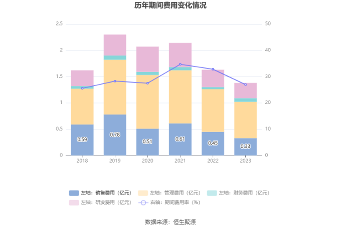 2023年,公司期间费用为1.37亿元,较上年同期减少2587.42万元;期间费用率为26.96%,较上年同期下降5.85个百分点。其中,销售费用同比下降27.77%,管理费用同比下降14.51%,研发费用同比下降12.58%,财务费用同比增长58.7%。