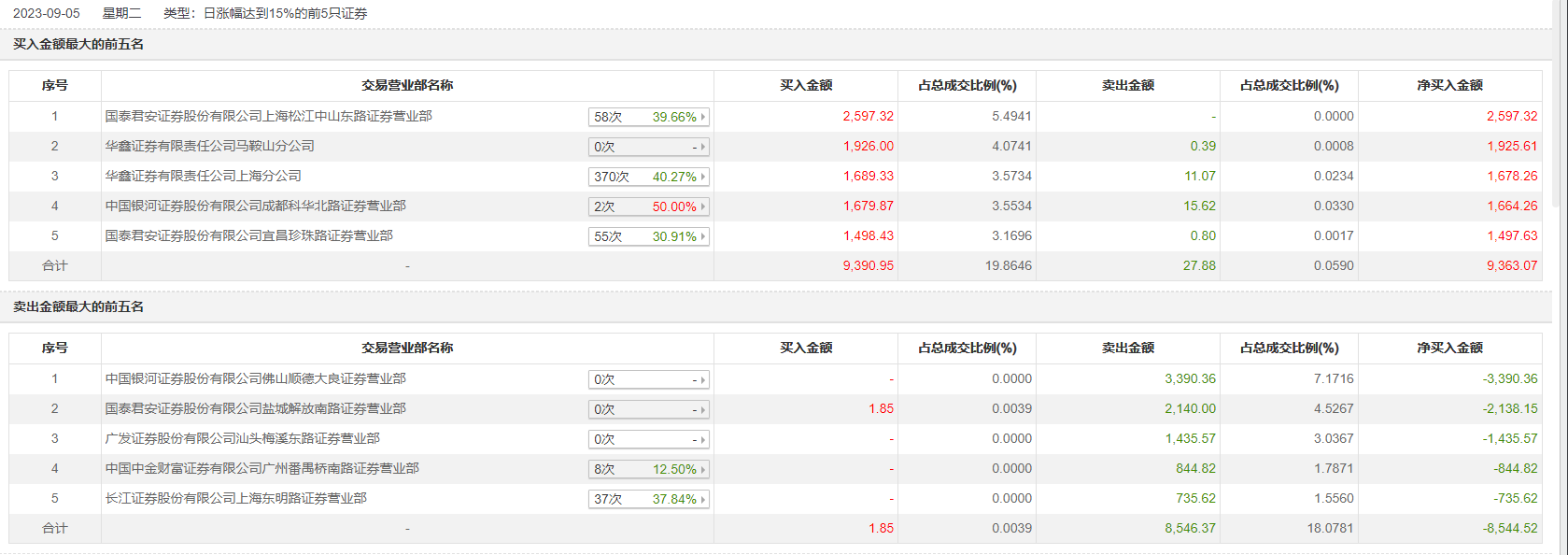 具体来看,国泰君安证券上海松江中山东路证券营业部、华鑫证券马鞍山分公司分别买入2597.32万元、1926.00万元;中国银河证券佛山顺德大良证券营业部、国泰君安证券盐城解放南路证券营业部分别卖出3390.36万元、2140.00万元。