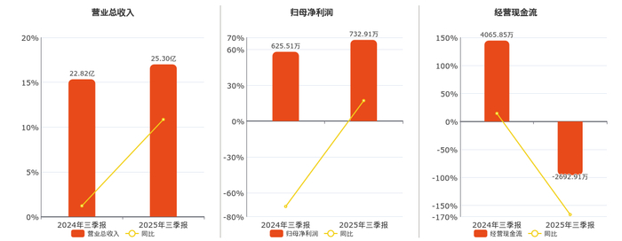 公司营业总收入为25.30亿元。归母净利润为732.91万元。经营活动现金净流入为-2692.91万元,较去年同报告期经营活动现金净流入减少6758.77万元,同比较去年同期下降166.23%。