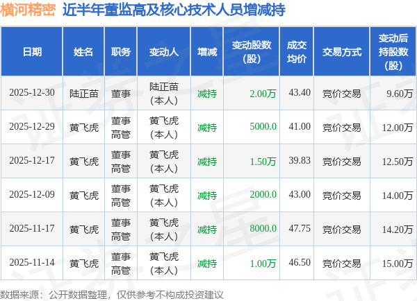 证券之星消息,根据12月31日市场公开信息、上市公司公告及交易所披露数据整理,横河精密(300539)最新董监高及相关人员股份变动情况:2025年12月30日公司董事陆正苗共减持公司股份2.0万股,占公司总股本为0.0075%。变动期间公司股价上涨6.44%,12月30日当日收盘报43.5元。