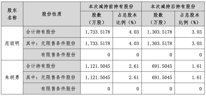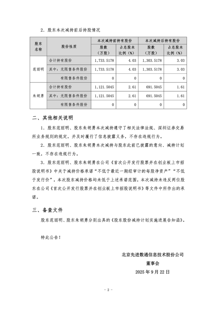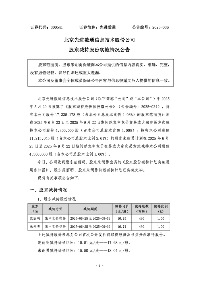 今日,先进数通收到股东范丽明、股东朱胡勇出具的《股东股份减持计划实施进展告知函》,股东范丽明、股东朱胡勇前述减持计划已实施完毕。