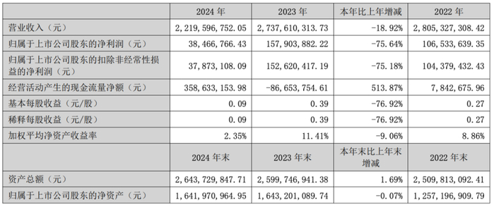 2024 年营收 22.2 亿,同比减少 18.92%;净利润 3847 万,同比减少 75.64%。