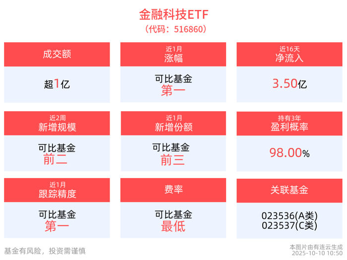 截至2025年10月10日10:50,中证金融科技主题指数下跌1.67%。成分股方面涨跌互现,先进数通领涨12.52%,电科数字上涨1.64%,恒银科技上涨0.59%;星环科技领跌6.78%,信安世纪下跌5.53%,普元信息下跌4.98%。金融科技ETF(516860)下跌1.82%,最新报价1.56元。拉长时间看,截至2025年10月9日,金融科技ETF近2周累计上涨1.14%,涨幅排名可比基金1/6。