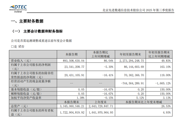 报告显示,先进数通公司前三季度营业收入为22.73亿元,同比增长49.83%;归母净利润为8614.46万元,同比增长163.10%;扣非归母净利润为7036.24万元,同比增长119.00%;基本每股收益0.20元。