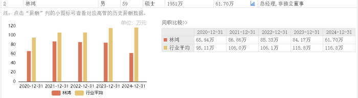 据东方财富网数据,先进数通总经理林鸿2021-2024年分别领薪86.86万、85.33万、84.17万和61.70万元,连续降薪三年。