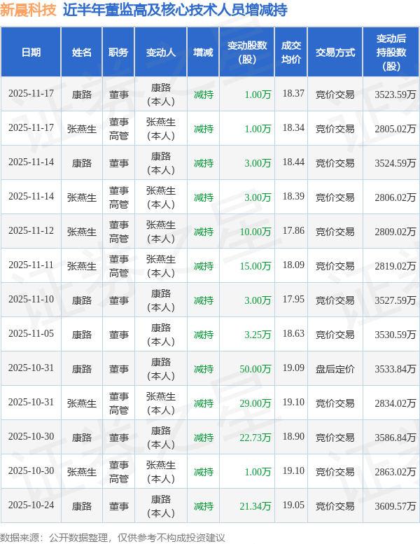 新晨科技近半年内的董监高及核心技术人员增减持详情如下: