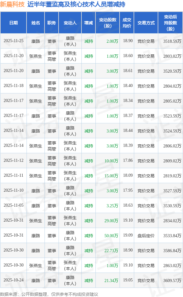 新晨科技近半年内的董监高及核心技术人员增减持详情如下: