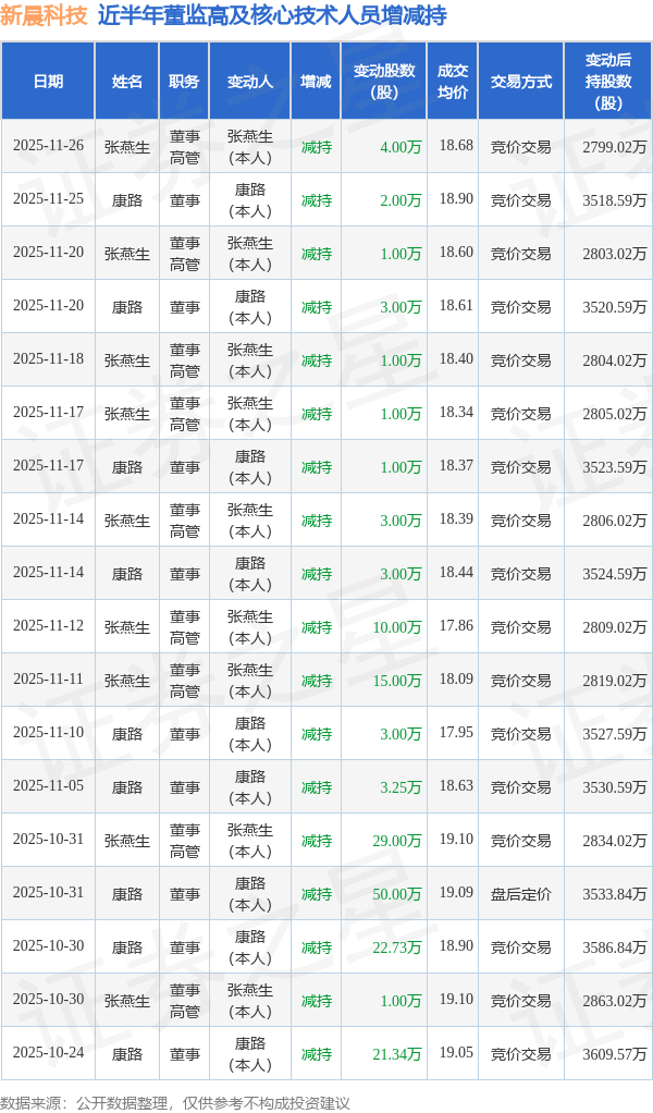 新晨科技近半年内的董监高及核心技术人员增减持详情如下: