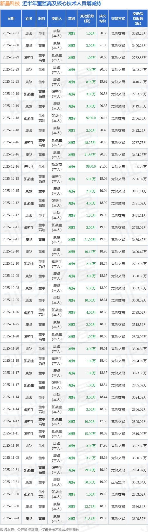 新晨科技近半年内的董监高及核心技术人员增减持详情如下: