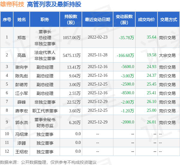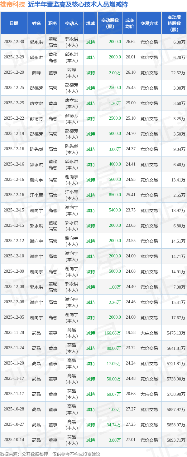 雄帝科技近半年内的董监高及核心技术人员增减持详情如下: