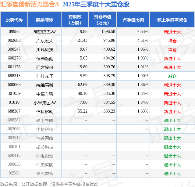汇添富创新活力混合A的前十大重仓股如下: