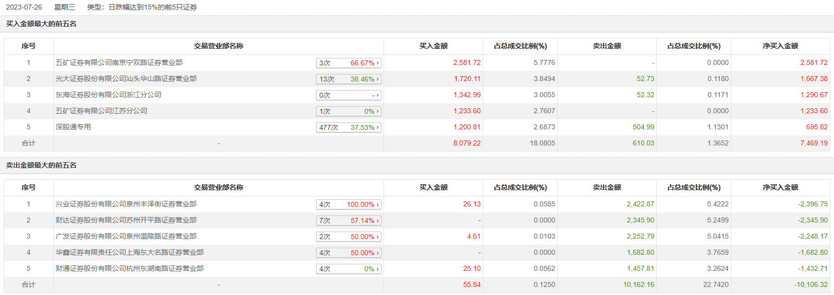 具体来看,兴业证券泉州丰泽街证券营业部、财达证券苏州开平路证券营业部分别卖出2422.87万元、2345.90万元;五矿证券有限公司南京宁双路证券营业部、光大证券汕头华山路证券营业部分别买入2581.72万元、1720.11万元。