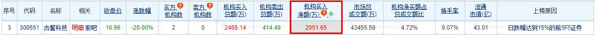 古鳌科技跌20% 机构净买入2052万元