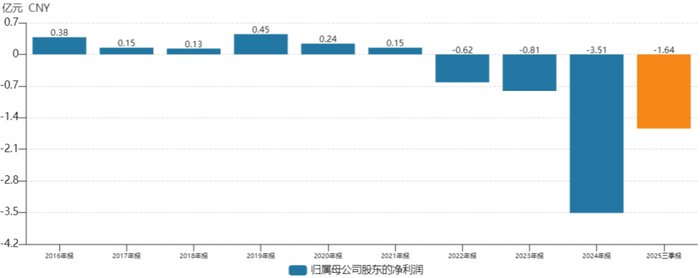 然而行业变迁的速度远超市场预期,古鳌科技上市后不久,外部环境便发生了剧烈变化,传统金融机具市场迎来前所未有的收缩压力。其间,古鳌科技也曾尝试过多次收购,从元宇宙、数字人到太阳能光伏、芯片等热门领域都有涉及,但这些并购大多停留在公告层面,无法真正落地。由此,2022年至2024年,公司归母净利润分别亏损0.62亿元、0.81亿元和3.51亿元,三年累计亏损近5亿元。2025年前三季度,公司实现营业收入1.09亿元,同比下降49.58%;实现归母净利润-1.64亿元。