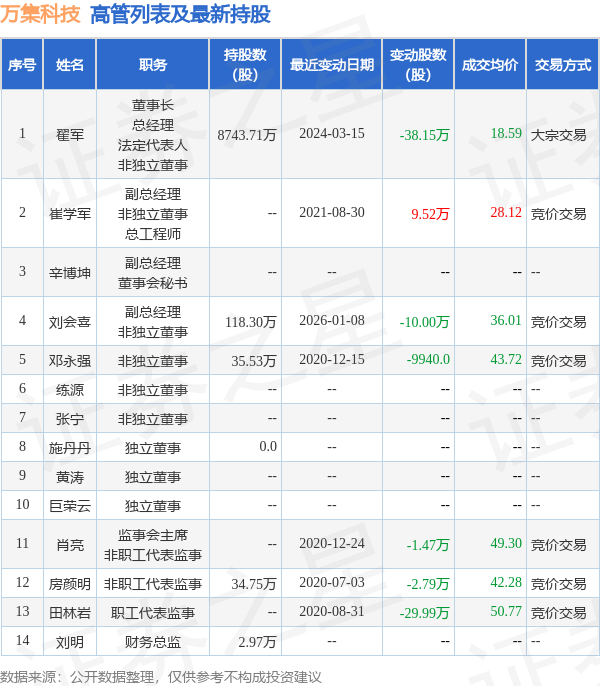 万集科技近半年内的董监高及核心技术人员增减持详情如下: