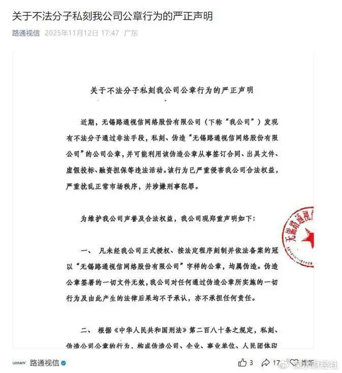 11月12日17时47分,路通视信官方微信公众号发表声明称,近期,公司发现“无锡路通视信网络股份有限公司”的公司公章被私刻、伪造,且该伪造公章或被用于从事签订合同、出具文件、虚假投标、融资担保等活动。