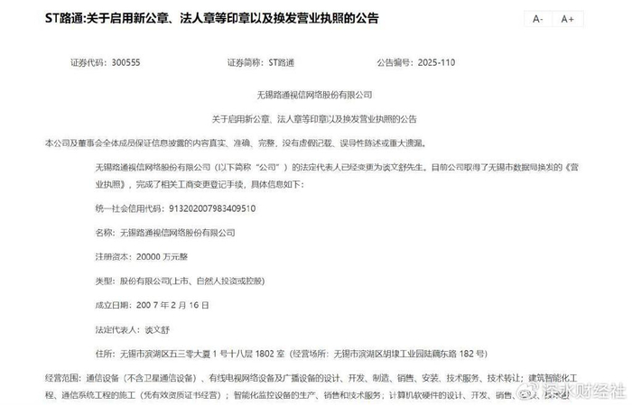 公众号发文1个小时后,ST路通披露《关于启用新公章、法人章等印章以及换发营业执照的公告》,明确公司法定代表人已变更为谈文舒,且已完成相关工商变更登记手续,取得换发的《营业执照》。