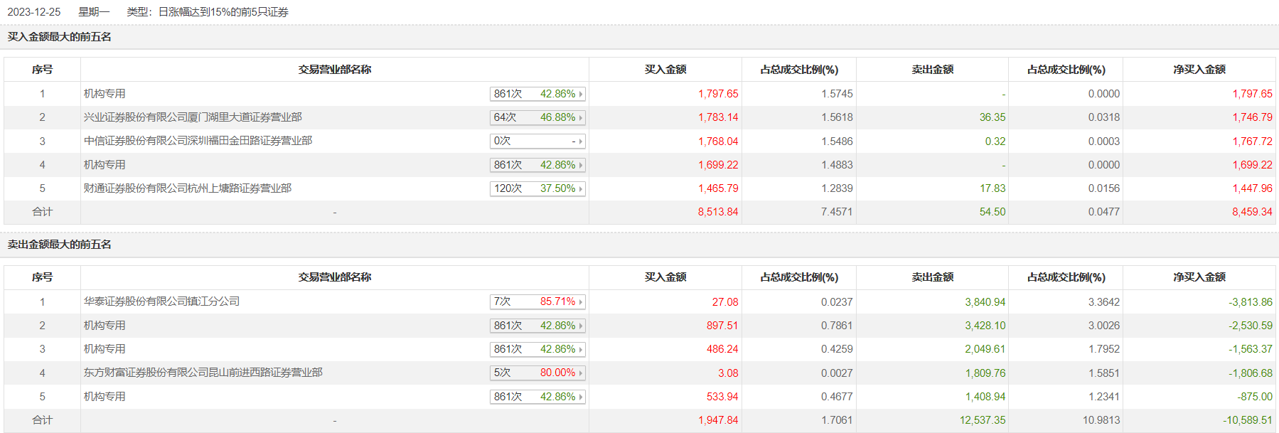 丝路视觉12月25日涨15.33%,全天换手率达34.4%,振幅达17.68%。龙虎榜数据显示,营业部席位合计净卖出2130.17万元。其中,机构买入5414.55万元,卖出6886.65万元,合计净卖出1472.1万元。此外,兴业证券厦门湖里大道证券营业部、中信证券深圳福田金田路证券营业部分别买入1783.14万元、1768.04万元;华泰证券镇江分公司、东方财富证券昆山前进西路证券营业部分别卖出3840.94万元、1809.76万元。