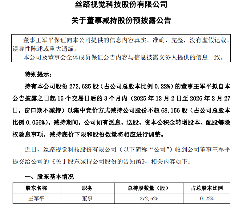 11月10日,丝路视觉(300556.SZ)发布公告,持股0.22%的董事王军平拟自公告披露之日起15个交易日后的3个月内(2025年12月2日至2026年2月27日,窗口期不减持)以集中竞价方式减持公司股份不超6.82万股(占公司总股本比例0.056%)。