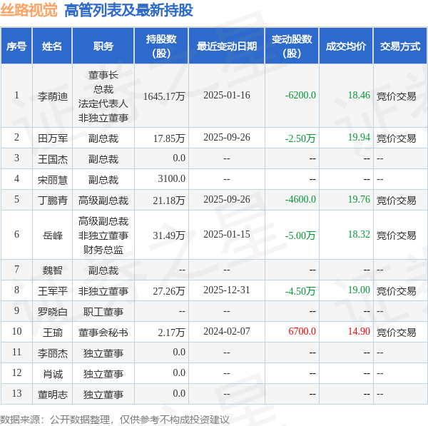 丝路视觉近半年内的董监高及核心技术人员增减持详情如下: