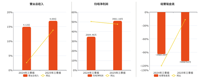 公司营业总收入为4.69亿元,较去年同报告期营业总收入增加5684.67万元,实现5年连续上涨,同比较去年同期上涨13.79%。归母净利润为3961.18万元,较去年同报告期归母净利润增加1276.72万元,实现5年连续上涨,同比较去年同期上涨47.56%。经营活动现金净流入为-4068.62万元。