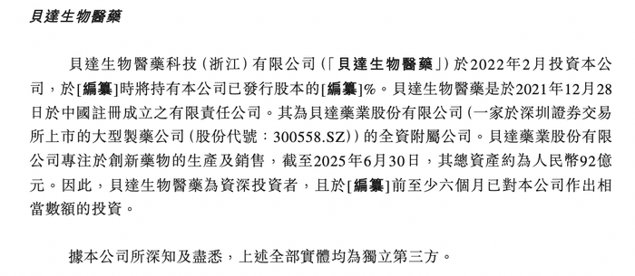 其中,贝达生物医药是于2021年12月28日于中国注册成立的有限责任公司。其为贝达药业股份有限公司(一家于深圳证券交易 所上市的大型制药公司(股份代号:300558.SZ))的全资附属公司。贝达药业股份有限公司专注于创新药物的生产及销售,截至2025年6月30日,其总资产约为92亿元。