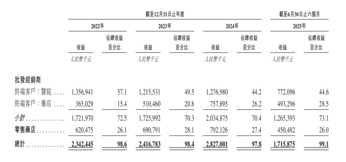 2022年-2025年上半年,贝达药业收入分别为23.77亿元、24.56亿元、28.92亿元及17.31亿元。公司主要向批发经销商销售产品,各期来自批发经销商的收入占比分别为72.5%、70.3%、70.4%及73.1%。而批发经销商最终多是将药品卖往医院。