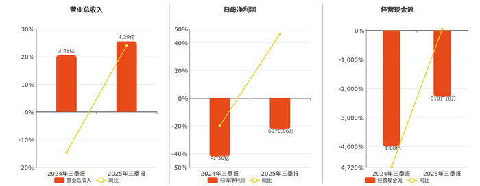 公司营业总收入为4.29亿元。归母净利润为-6970.96万元。经营活动现金净流入为-6181.18万元。