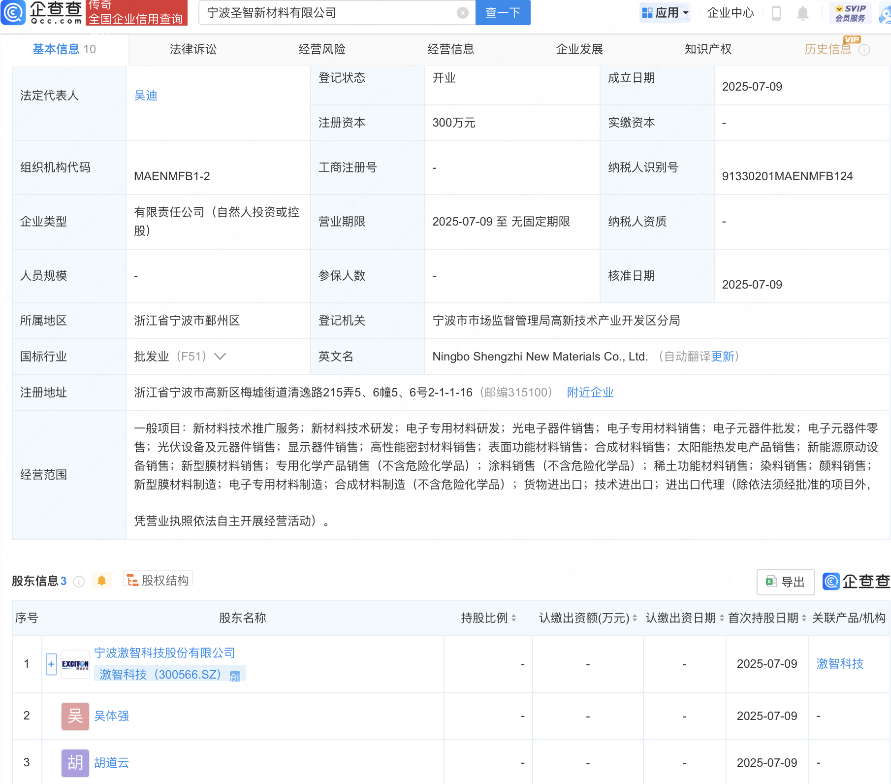 企查查APP显示,近日,宁波圣智新材料有限公司成立,法定代表人为吴迪,经营范围包含:显示器件销售;高性能密封材料销售;表面功能材料销售;合成材料销售;太阳能热发电产品销售等。企查查股权穿透显示,该公司由激智科技(300566)等共同持股。