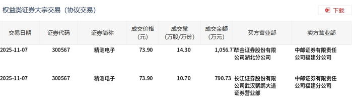 11月7日,精测电子大宗交易成交25万股,成交额1847.5万元,占当日总成交额的3.7%,成交价73.9元,较市场收盘价76.38元折价3.25%。