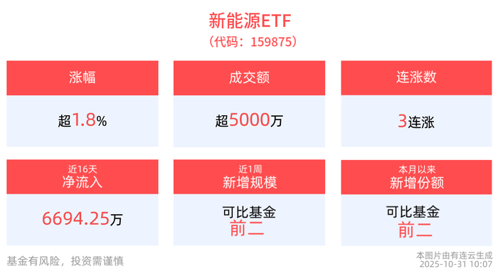截至2025年10月31日10:07,中证新能源指数强势上涨1.93%,成分股星源材质上涨12.18%,新宙邦上涨10.34%,恩捷股份10cm涨停,尚太科技,永兴材料等个股跟涨。新能源ETF(159875)盘中最高涨超2%,冲击3连涨。拉长时间看,截至2025年10月30日,新能源ETF近1周累计上涨9.38%。
