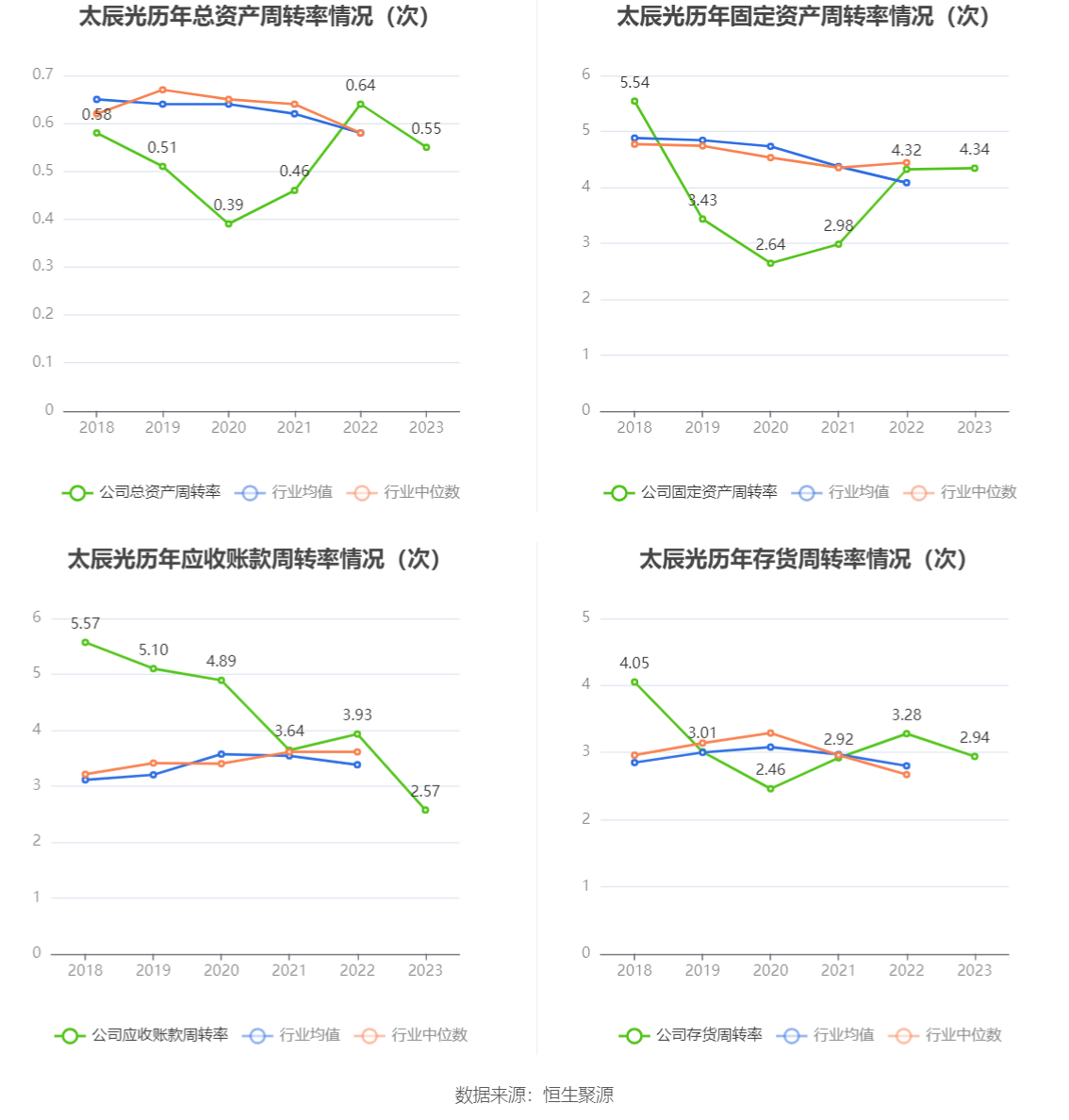 营运能力方面,2023年,公司公司总资产周转率为0.55次,上年同期为0.64次(2022年行业平均值为0.58次,公司位居同行业15/36);固定资产周转率为4.34次,上年同期为4.32次(2022年行业平均值为4.08次,公司位居同行业19/36);公司应收账款周转率、存货周转率分别为2.57次、2.94次。