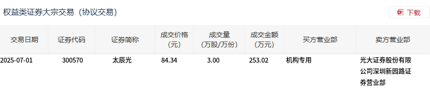 太辰光今日大宗交易折价成交3万股,成交额253.02万元