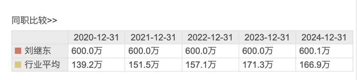 东方财富数据显示,2020年至2024年,刘继东薪酬均为600万元。